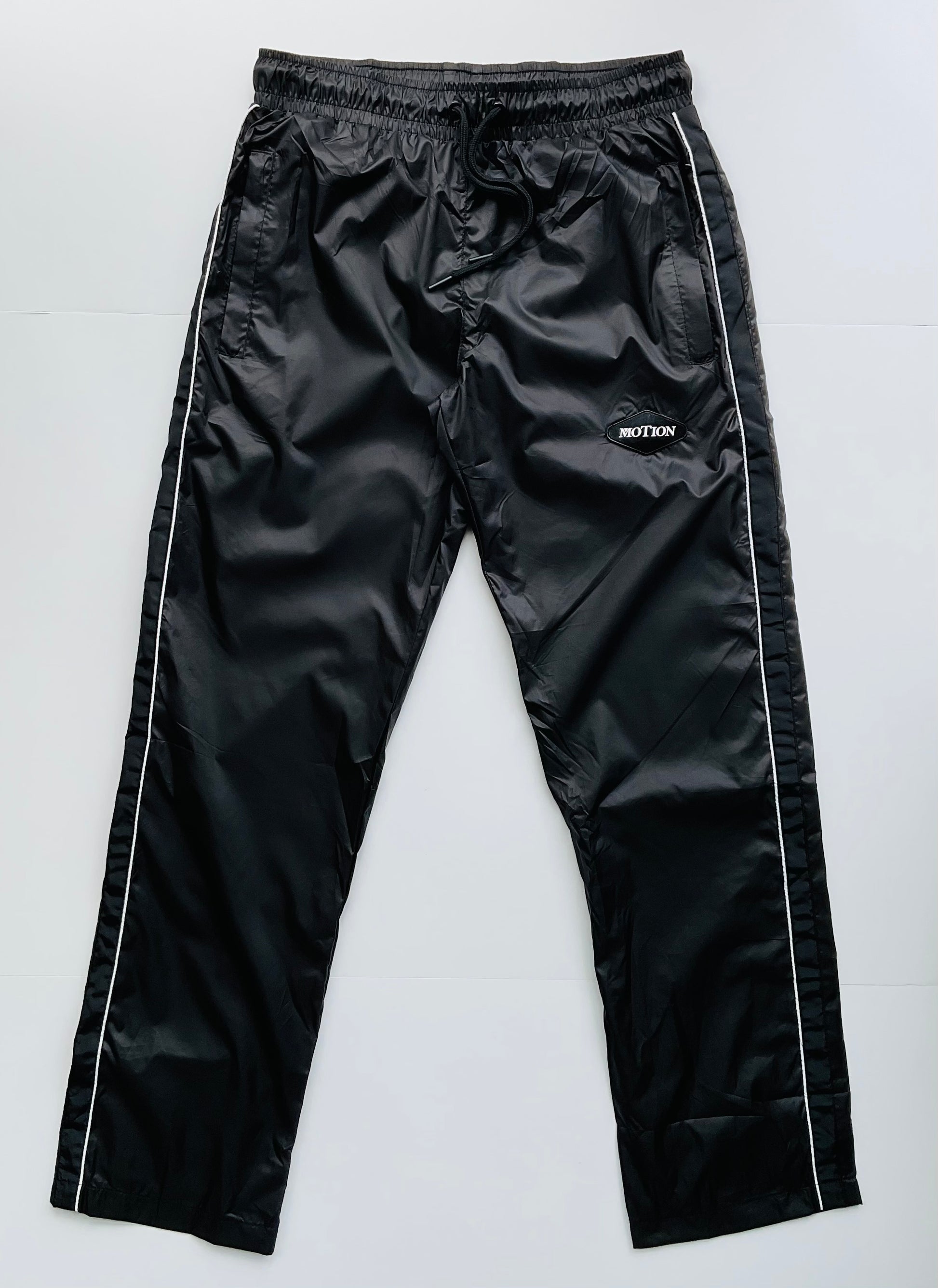 Light weight matte black nylon pants with mesh lining. Zipper side pockets and Motion rubber logo patch on left leg, with matching detail on white side piping on legs. Drawstring waist for comfort fit and slightly oversized cut.